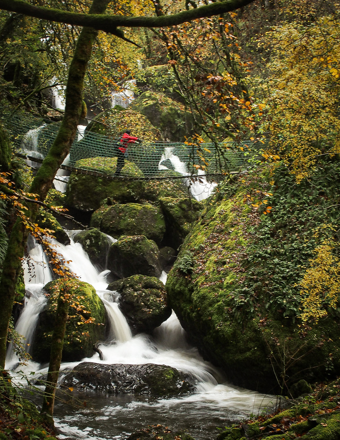 Il faut être bien chaussés à cette période, la cascade rendant les abords du sentier bien boueux. Mais le plaisir est extrême dès que nous sommes derrière le rideau d’eau 💦. Le bruit est assourdissant, même un peu trop pour Mini-M qui se bouche rapidement les oreilles. On ne stationne de toute façon pas longtemps là, l’appel du sentier forestier qui s’annonce multicolore est puissant.