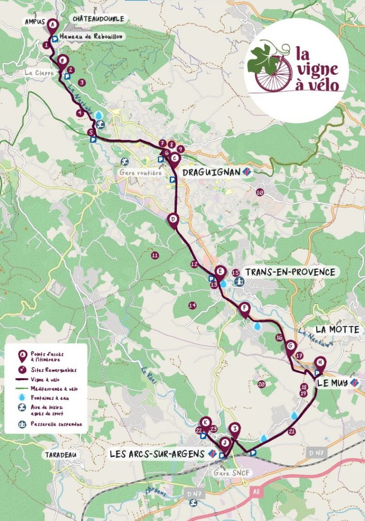 « L’itinéraire de la Vigne à Vélo déroule, des Arcs-sur-Argens aux gorges de Châteaudouble, 28 km de voies vertes et de véloroutes. Forêt, vignoble, villages et musées à découvrir à votre rythme. » C’est ce que promet le site internet de Dracénie Tourisme. À nous de vérifier !